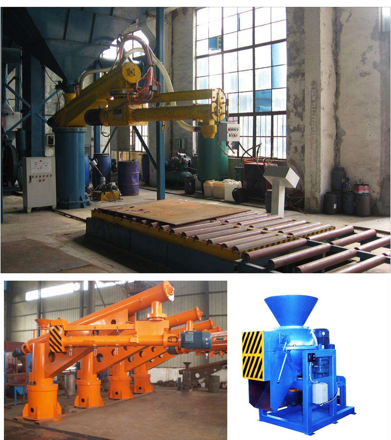 树脂砂生产线是由磁选皮带输送机、震动破碎再生机、离心转子二次二级再生机、砂库、斗式提升机(3套)、移动双臂连续式树脂砂混砂机、脉冲反吹式除尘器等设备组成的。